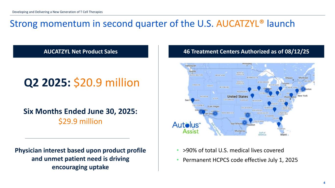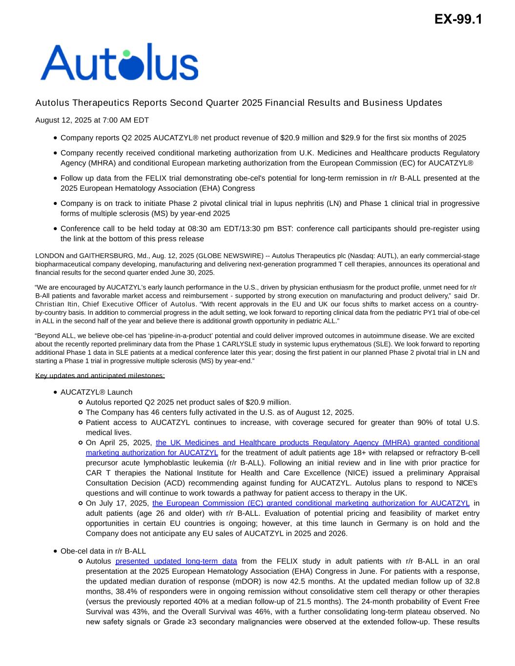 Autolus Therapeutics Reports Second Quarter 2025 Financial Results and Business Updates August 12, 2025 at 7:00 AM EDT Company reports Q2 2025 AUCATZYL® net product revenue of $20.9 million and $29.9 for the first six months of 2025 Company recently received conditional marketing authorization from U.K. Medicines and Healthcare products Regulatory Agency (MHRA) and conditional European marketing authorization from the European Commission (EC) for AUCATZYL® Follow up data from the FELIX trial demonstrating obe-cel's potential for long-term remission in r/r B-ALL presented at the 2025 European Hematology Association (EHA) Congress Company is on track to initiate Phase 2 pivotal clinical trial in lupus nephritis (LN) and Phase 1 clinical trial in progressive forms of multiple sclerosis (MS) by year-end 2025 Conference call to be held today at 08:30 am EDT/13:30 pm BST: conference call participants should pre-register using the link at the bottom of this press release LONDON and GAITHERSBURG, Md., Aug. 12, 2025 (GLOBE NEWSWIRE) -- Autolus Therapeutics plc (Nasdaq: AUTL), an early commercial-stage biopharmaceutical company developing, manufacturing and delivering next-generation programmed T cell therapies, announces its operational and financial results for the second quarter ended June 30, 2025. “We are encouraged by AUCATZYL’s early launch performance in the U.S., driven by physician enthusiasm for the product profile, unmet need for r/r B-All patients and favorable market access and reimbursement - supported by strong execution on manufacturing and product delivery,” said Dr. Christian Itin, Chief Executive Officer of Autolus. “With recent approvals in the EU and UK our focus shifts to market access on a country- by-country basis. In addition to commercial progress in the adult setting, we look forward to reporting clinical data from the pediatric PY1 trial of obe-cel in ALL in the second half of the year and believe there is additional growth opportunity in pediatric ALL.” “Beyond ALL, we believe obe-cel has ‘pipeline-in-a-product’ potential and could deliver improved outcomes in autoimmune disease. We are excited about the recently reported preliminary data from the Phase 1 CARLYSLE study in systemic lupus erythematous (SLE). We look forward to reporting additional Phase 1 data in SLE patients at a medical conference later this year; dosing the first patient in our planned Phase 2 pivotal trial in LN and starting a Phase 1 trial in progressive multiple sclerosis (MS) by year-end.” Key updates and anticipated milestones: AUCATZYL® Launch Autolus reported Q2 2025 net product sales of $20.9 million. The Company has 46 centers fully activated in the U.S. as of August 12, 2025. Patient access to AUCATZYL continues to increase, with coverage secured for greater than 90% of total U.S. medical lives. On April 25, 2025, the UK Medicines and Healthcare products Regulatory Agency (MHRA) granted conditional marketing authorization for AUCATZYL for the treatment of adult patients age 18+ with relapsed or refractory B-cell precursor acute lymphoblastic leukemia (r/r B-ALL). Following an initial review and in line with prior practice for CAR T therapies the National Institute for Health and Care Excellence (NICE) issued a preliminary Appraisal Consultation Decision (ACD) recommending against funding for AUCATZYL. Autolus plans to respond to NICE’s questions and will continue to work towards a pathway for patient access to therapy in the UK. On July 17, 2025, the European Commission (EC) granted conditional marketing authorization for AUCATZYL in adult patients (age 26 and older) with r/r B-ALL. Evaluation of potential pricing and feasibility of market entry opportunities in certain EU countries is ongoing; however, at this time launch in Germany is on hold and the Company does not anticipate any EU sales of AUCATZYL in 2025 and 2026. Obe-cel data in r/r B-ALL Autolus presented updated long-term data from the FELIX study in adult patients with r/r B-ALL in an oral presentation at the 2025 European Hematology Association (EHA) Congress in June. For patients with a response, the updated median duration of response (mDOR) is now 42.5 months. At the updated median follow up of 32.8 months, 38.4% of responders were in ongoing remission without consolidative stem cell therapy or other therapies (versus the previously reported 40% at a median follow-up of 21.5 months). The 24-month probability of Event Free Survival was 43%, and the Overall Survival was 46%, with a further consolidating long-term plateau observed. No new safety signals or Grade ≥3 secondary malignancies were observed at the extended follow-up. These results EX-99.1