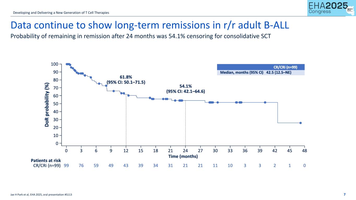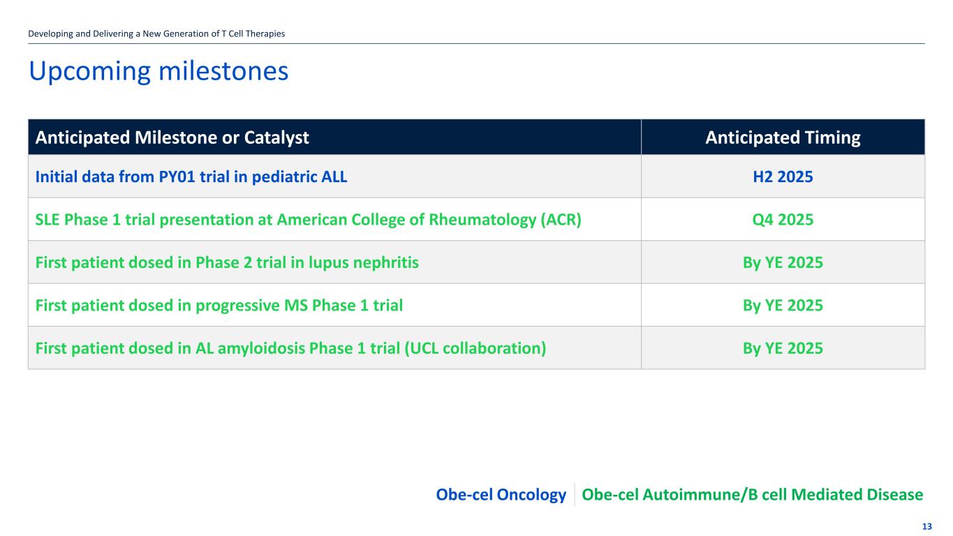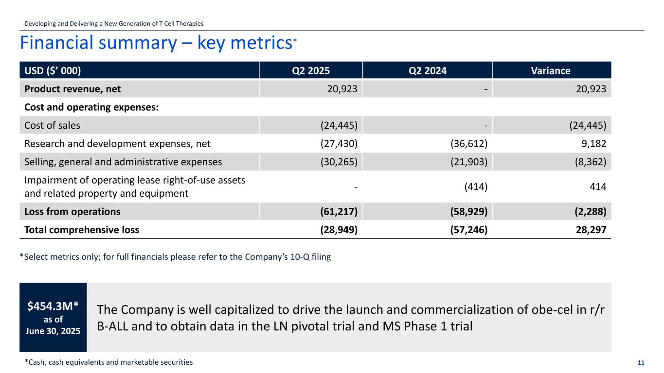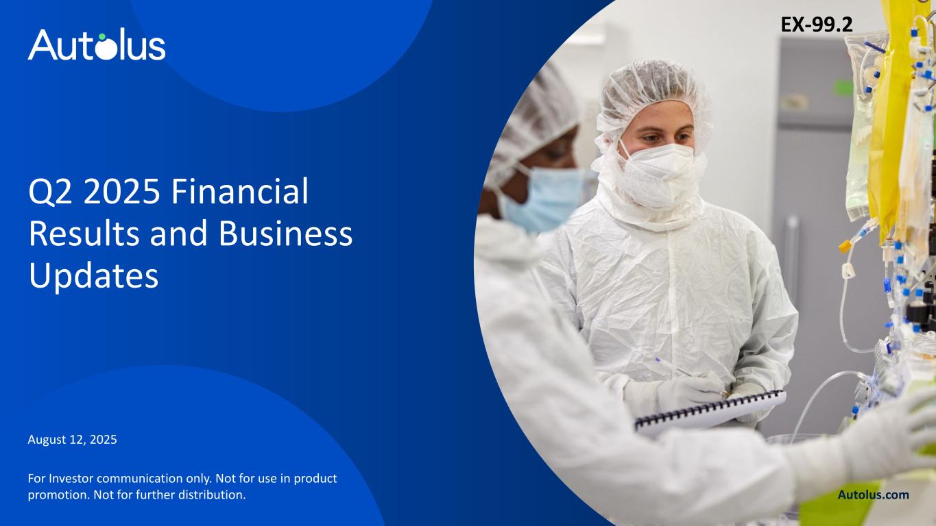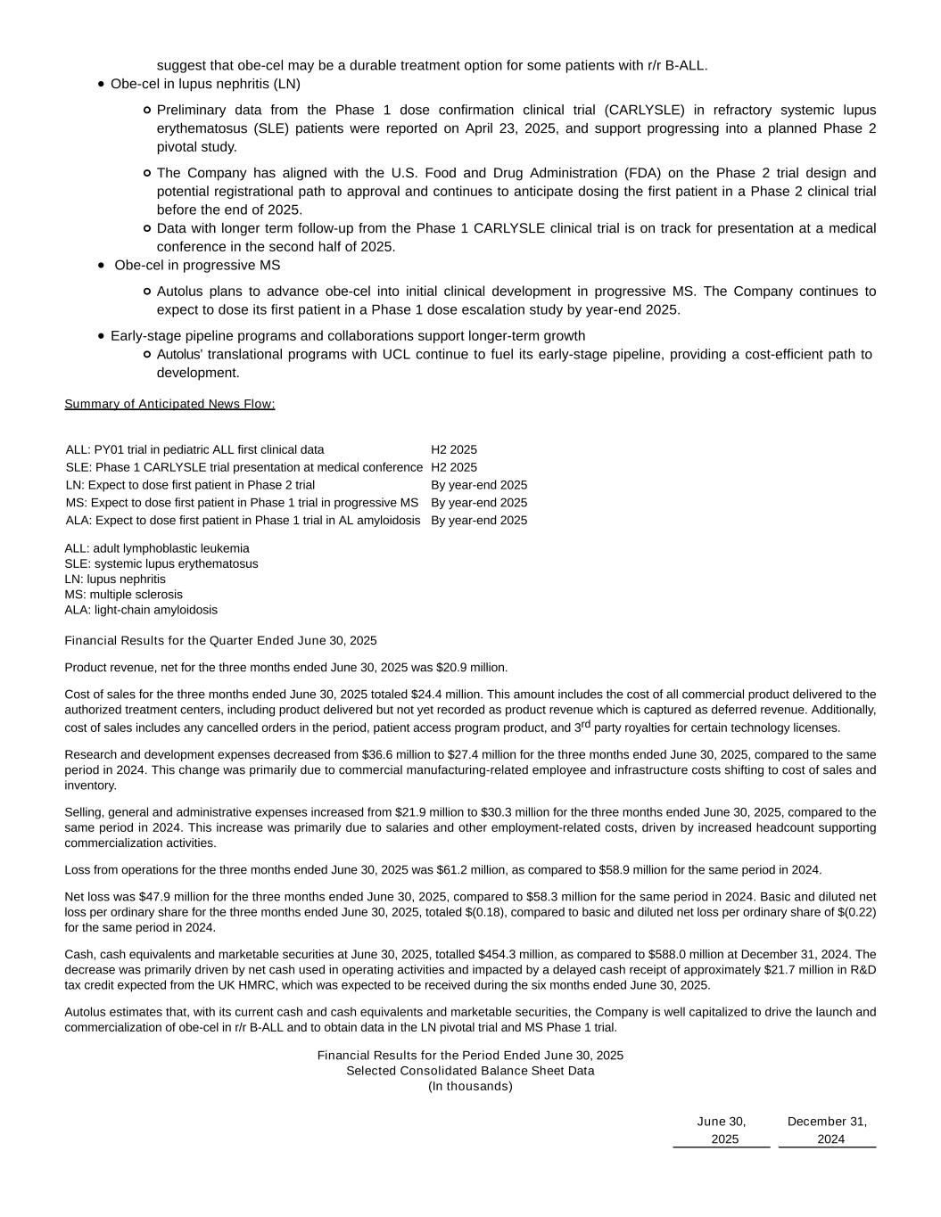 suggest that obe-cel may be a durable treatment option for some patients with r/r B-ALL. Obe-cel in lupus nephritis (LN) Preliminary data from the Phase 1 dose confirmation clinical trial (CARLYSLE) in refractory systemic lupus erythematosus (SLE) patients were reported on April 23, 2025, and support progressing into a planned Phase 2 pivotal study. The Company has aligned with the U.S. Food and Drug Administration (FDA) on the Phase 2 trial design and potential registrational path to approval and continues to anticipate dosing the first patient in a Phase 2 clinical trial before the end of 2025. Data with longer term follow-up from the Phase 1 CARLYSLE clinical trial is on track for presentation at a medical conference in the second half of 2025. Obe-cel in progressive MS Autolus plans to advance obe-cel into initial clinical development in progressive MS. The Company continues to expect to dose its first patient in a Phase 1 dose escalation study by year-end 2025. Early-stage pipeline programs and collaborations support longer-term growth Autolus’ translational programs with UCL continue to fuel its early-stage pipeline, providing a cost-efficient path to development. Summary of Anticipated News Flow: ALL: PY01 trial in pediatric ALL first clinical data H2 2025 SLE: Phase 1 CARLYSLE trial presentation at medical conference H2 2025 LN: Expect to dose first patient in Phase 2 trial By year-end 2025 MS: Expect to dose first patient in Phase 1 trial in progressive MS By year-end 2025 ALA: Expect to dose first patient in Phase 1 trial in AL amyloidosis By year-end 2025 ALL: adult lymphoblastic leukemia SLE: systemic lupus erythematosus LN: lupus nephritis MS: multiple sclerosis ALA: light-chain amyloidosis Financial Results for the Quarter Ended June 30, 2025 Product revenue, net for the three months ended June 30, 2025 was $20.9 million. Cost of sales for the three months ended June 30, 2025 totaled $24.4 million. This amount includes the cost of all commercial product delivered to the authorized treatment centers, including product delivered but not yet recorded as product revenue which is captured as deferred revenue. Additionally, cost of sales includes any cancelled orders in the period, patient access program product, and 3rd party royalties for certain technology licenses. Research and development expenses decreased from $36.6 million to $27.4 million for the three months ended June 30, 2025, compared to the same period in 2024. This change was primarily due to commercial manufacturing-related employee and infrastructure costs shifting to cost of sales and inventory. Selling, general and administrative expenses increased from $21.9 million to $30.3 million for the three months ended June 30, 2025, compared to the same period in 2024. This increase was primarily due to salaries and other employment-related costs, driven by increased headcount supporting commercialization activities. Loss from operations for the three months ended June 30, 2025 was $61.2 million, as compared to $58.9 million for the same period in 2024. Net loss was $47.9 million for the three months ended June 30, 2025, compared to $58.3 million for the same period in 2024. Basic and diluted net loss per ordinary share for the three months ended June 30, 2025, totaled $(0.18), compared to basic and diluted net loss per ordinary share of $(0.22) for the same period in 2024. Cash, cash equivalents and marketable securities at June 30, 2025, totalled $454.3 million, as compared to $588.0 million at December 31, 2024. The decrease was primarily driven by net cash used in operating activities and impacted by a delayed cash receipt of approximately $21.7 million in R&D tax credit expected from the UK HMRC, which was expected to be received during the six months ended June 30, 2025. Autolus estimates that, with its current cash and cash equivalents and marketable securities, the Company is well capitalized to drive the launch and commercialization of obe-cel in r/r B-ALL and to obtain data in the LN pivotal trial and MS Phase 1 trial. Financial Results for the Period Ended June 30, 2025 Selected Consolidated Balance Sheet Data (In thousands) June 30, December 31, 2025 2024
