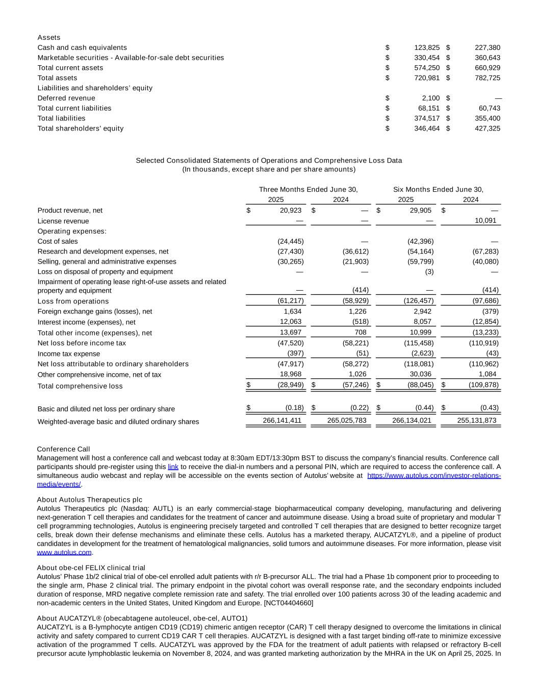 Assets Cash and cash equivalents $ 123,825 $ 227,380 Marketable securities - Available-for-sale debt securities $ 330,454 $ 360,643 Total current assets $ 574,250 $ 660,929 Total assets $ 720,981 $ 782,725 Liabilities and shareholders’ equity Deferred revenue $ 2,100 $ — Total current liabilities $ 68,151 $ 60,743 Total liabilities $ 374,517 $ 355,400 Total shareholders' equity $ 346,464 $ 427,325 Selected Consolidated Statements of Operations and Comprehensive Loss Data (In thousands, except share and per share amounts) Three Months Ended June 30, Six Months Ended June 30, 2025 2024 2025 2024 Product revenue, net $ 20,923 $ — $ 29,905 $ — License revenue — — — 10,091 Operating expenses: Cost of sales (24,445) — (42,396) — Research and development expenses, net (27,430) (36,612) (54,164) (67,283) Selling, general and administrative expenses (30,265) (21,903) (59,799) (40,080) Loss on disposal of property and equipment — — (3) — Impairment of operating lease right-of-use assets and related property and equipment — (414) — (414) Loss from operations (61,217) (58,929) (126,457) (97,686) Foreign exchange gains (losses), net 1,634 1,226 2,942 (379) Interest income (expenses), net 12,063 (518) 8,057 (12,854) Total other income (expenses), net 13,697 708 10,999 (13,233) Net loss before income tax (47,520) (58,221) (115,458) (110,919) Income tax expense (397) (51) (2,623) (43) Net loss attributable to ordinary shareholders (47,917) (58,272) (118,081) (110,962) Other comprehensive income, net of tax 18,968 1,026 30,036 1,084 Total comprehensive loss $ (28,949) $ (57,246) $ (88,045) $ (109,878) Basic and diluted net loss per ordinary share $ (0.18) $ (0.22) $ (0.44) $ (0.43) Weighted-average basic and diluted ordinary shares 266,141,411 265,025,783 266,134,021 255,131,873 Conference Call Management will host a conference call and webcast today at 8:30am EDT/13:30pm BST to discuss the company’s financial results. Conference call participants should pre-register using this link to receive the dial-in numbers and a personal PIN, which are required to access the conference call. A simultaneous audio webcast and replay will be accessible on the events section of Autolus’ website at https://www.autolus.com/investor-relations- media/events/. About Autolus Therapeutics plc Autolus Therapeutics plc (Nasdaq: AUTL) is an early commercial-stage biopharmaceutical company developing, manufacturing and delivering next-generation T cell therapies and candidates for the treatment of cancer and autoimmune disease. Using a broad suite of proprietary and modular T cell programming technologies, Autolus is engineering precisely targeted and controlled T cell therapies that are designed to better recognize target cells, break down their defense mechanisms and eliminate these cells. Autolus has a marketed therapy, AUCATZYL®, and a pipeline of product candidates in development for the treatment of hematological malignancies, solid tumors and autoimmune diseases. For more information, please visit www.autolus.com. About obe-cel FELIX clinical trial Autolus’ Phase 1b/2 clinical trial of obe-cel enrolled adult patients with r/r B-precursor ALL. The trial had a Phase 1b component prior to proceeding to the single arm, Phase 2 clinical trial. The primary endpoint in the pivotal cohort was overall response rate, and the secondary endpoints included duration of response, MRD negative complete remission rate and safety. The trial enrolled over 100 patients across 30 of the leading academic and non-academic centers in the United States, United Kingdom and Europe. [NCT04404660] About AUCATZYL® (obecabtagene autoleucel, obe-cel, AUTO1) AUCATZYL is a B-lymphocyte antigen CD19 (CD19) chimeric antigen receptor (CAR) T cell therapy designed to overcome the limitations in clinical activity and safety compared to current CD19 CAR T cell therapies. AUCATZYL is designed with a fast target binding off-rate to minimize excessive activation of the programmed T cells. AUCATZYL was approved by the FDA for the treatment of adult patients with relapsed or refractory B-cell precursor acute lymphoblastic leukemia on November 8, 2024, and was granted marketing authorization by the MHRA in the UK on April 25, 2025. In