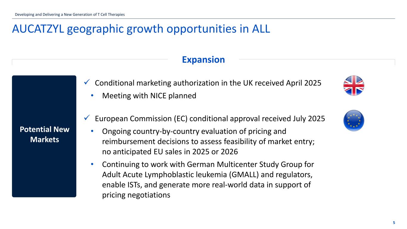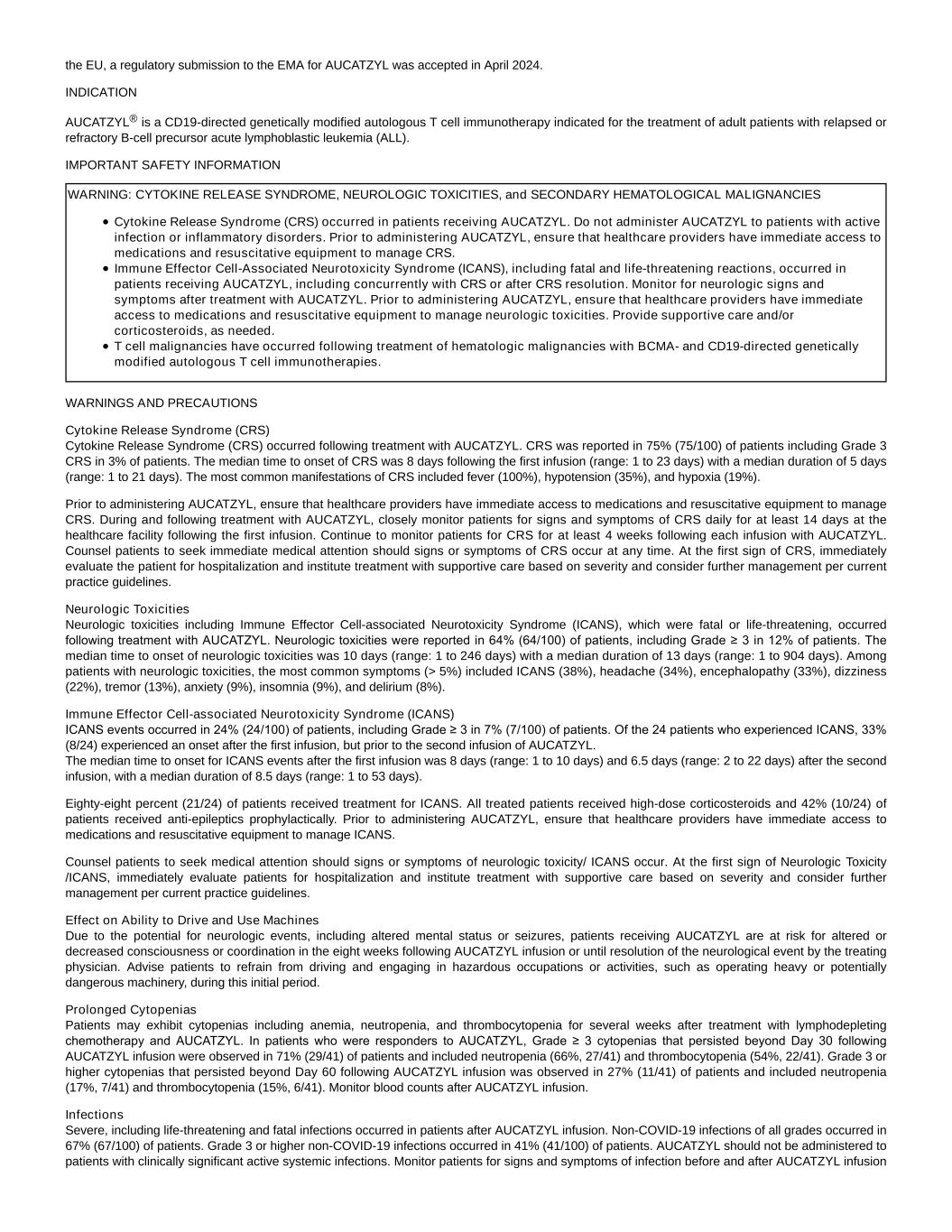the EU, a regulatory submission to the EMA for AUCATZYL was accepted in April 2024. INDICATION AUCATZYL® is a CD19-directed genetically modified autologous T cell immunotherapy indicated for the treatment of adult patients with relapsed or refractory B-cell precursor acute lymphoblastic leukemia (ALL). IMPORTANT SAFETY INFORMATION WARNING: CYTOKINE RELEASE SYNDROME, NEUROLOGIC TOXICITIES, and SECONDARY HEMATOLOGICAL MALIGNANCIES Cytokine Release Syndrome (CRS) occurred in patients receiving AUCATZYL. Do not administer AUCATZYL to patients with active infection or inflammatory disorders. Prior to administering AUCATZYL, ensure that healthcare providers have immediate access to medications and resuscitative equipment to manage CRS. Immune Effector Cell-Associated Neurotoxicity Syndrome (ICANS), including fatal and life-threatening reactions, occurred in patients receiving AUCATZYL, including concurrently with CRS or after CRS resolution. Monitor for neurologic signs and symptoms after treatment with AUCATZYL. Prior to administering AUCATZYL, ensure that healthcare providers have immediate access to medications and resuscitative equipment to manage neurologic toxicities. Provide supportive care and/or corticosteroids, as needed. T cell malignancies have occurred following treatment of hematologic malignancies with BCMA- and CD19-directed genetically modified autologous T cell immunotherapies. WARNINGS AND PRECAUTIONS Cytokine Release Syndrome (CRS) Cytokine Release Syndrome (CRS) occurred following treatment with AUCATZYL. CRS was reported in 75% (75/100) of patients including Grade 3 CRS in 3% of patients. The median time to onset of CRS was 8 days following the first infusion (range: 1 to 23 days) with a median duration of 5 days (range: 1 to 21 days). The most common manifestations of CRS included fever (100%), hypotension (35%), and hypoxia (19%). Prior to administering AUCATZYL, ensure that healthcare providers have immediate access to medications and resuscitative equipment to manage CRS. During and following treatment with AUCATZYL, closely monitor patients for signs and symptoms of CRS daily for at least 14 days at the healthcare facility following the first infusion. Continue to monitor patients for CRS for at least 4 weeks following each infusion with AUCATZYL. Counsel patients to seek immediate medical attention should signs or symptoms of CRS occur at any time. At the first sign of CRS, immediately evaluate the patient for hospitalization and institute treatment with supportive care based on severity and consider further management per current practice guidelines. Neurologic Toxicities Neurologic toxicities including Immune Effector Cell-associated Neurotoxicity Syndrome (ICANS), which were fatal or life-threatening, occurred following treatment with AUCATZYL. Neurologic toxicities were reported in 64% (64/100) of patients, including Grade ≥ 3 in 12% of patients. The median time to onset of neurologic toxicities was 10 days (range: 1 to 246 days) with a median duration of 13 days (range: 1 to 904 days). Among patients with neurologic toxicities, the most common symptoms (> 5%) included ICANS (38%), headache (34%), encephalopathy (33%), dizziness (22%), tremor (13%), anxiety (9%), insomnia (9%), and delirium (8%). Immune Effector Cell-associated Neurotoxicity Syndrome (ICANS) ICANS events occurred in 24% (24/100) of patients, including Grade ≥ 3 in 7% (7/100) of patients. Of the 24 patients who experienced ICANS, 33% (8/24) experienced an onset after the first infusion, but prior to the second infusion of AUCATZYL. The median time to onset for ICANS events after the first infusion was 8 days (range: 1 to 10 days) and 6.5 days (range: 2 to 22 days) after the second infusion, with a median duration of 8.5 days (range: 1 to 53 days). Eighty-eight percent (21/24) of patients received treatment for ICANS. All treated patients received high-dose corticosteroids and 42% (10/24) of patients received anti-epileptics prophylactically. Prior to administering AUCATZYL, ensure that healthcare providers have immediate access to medications and resuscitative equipment to manage ICANS. Counsel patients to seek medical attention should signs or symptoms of neurologic toxicity/ ICANS occur. At the first sign of Neurologic Toxicity /ICANS, immediately evaluate patients for hospitalization and institute treatment with supportive care based on severity and consider further management per current practice guidelines. Effect on Ability to Drive and Use Machines Due to the potential for neurologic events, including altered mental status or seizures, patients receiving AUCATZYL are at risk for altered or decreased consciousness or coordination in the eight weeks following AUCATZYL infusion or until resolution of the neurological event by the treating physician. Advise patients to refrain from driving and engaging in hazardous occupations or activities, such as operating heavy or potentially dangerous machinery, during this initial period. Prolonged Cytopenias Patients may exhibit cytopenias including anemia, neutropenia, and thrombocytopenia for several weeks after treatment with lymphodepleting chemotherapy and AUCATZYL. In patients who were responders to AUCATZYL, Grade ≥ 3 cytopenias that persisted beyond Day 30 following AUCATZYL infusion were observed in 71% (29/41) of patients and included neutropenia (66%, 27/41) and thrombocytopenia (54%, 22/41). Grade 3 or higher cytopenias that persisted beyond Day 60 following AUCATZYL infusion was observed in 27% (11/41) of patients and included neutropenia (17%, 7/41) and thrombocytopenia (15%, 6/41). Monitor blood counts after AUCATZYL infusion. Infections Severe, including life-threatening and fatal infections occurred in patients after AUCATZYL infusion. Non-COVID-19 infections of all grades occurred in 67% (67/100) of patients. Grade 3 or higher non-COVID-19 infections occurred in 41% (41/100) of patients. AUCATZYL should not be administered to pa