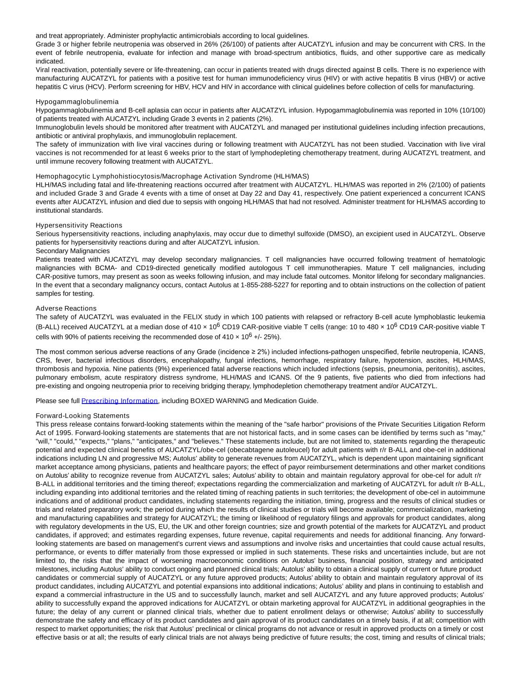 and treat appropriately. Administer prophylactic antimicrobials according to local guidelines. Grade 3 or higher febrile neutropenia was observed in 26% (26/100) of patients after AUCATZYL infusion and may be concurrent with CRS. In the event of febrile neutropenia, evaluate for infection and manage with broad-spectrum antibiotics, fluids, and other supportive care as medically indicated. Viral reactivation, potentially severe or life-threatening, can occur in patients treated with drugs directed against B cells. There is no experience with manufacturing AUCATZYL for patients with a positive test for human immunodeficiency virus (HIV) or with active hepatitis B virus (HBV) or active hepatitis C virus (HCV). Perform screening for HBV, HCV and HIV in accordance with clinical guidelines before collection of cells for manufacturing. Hypogammaglobulinemia Hypogammaglobulinemia and B-cell aplasia can occur in patients after AUCATZYL infusion. Hypogammaglobulinemia was reported in 10% (10/100) of patients treated with AUCATZYL including Grade 3 events in 2 patients (2%). Immunoglobulin levels should be monitored after treatment with AUCATZYL and managed per institutional guidelines including infection precautions, antibiotic or antiviral prophylaxis, and immunoglobulin replacement. The safety of immunization with live viral vaccines during or following treatment with AUCATZYL has not been studied. Vaccination with live viral vaccines is not recommended for at least 6 weeks prior to the start of lymphodepleting chemotherapy treatment, during AUCATZYL treatment, and until immune recovery following treatment with AUCATZYL. Hemophagocytic Lymphohistiocytosis/Macrophage Activation Syndrome (HLH/MAS) HLH/MAS including fatal and life-threatening reactions occurred after treatment with AUCATZYL. HLH/MAS was reported in 2% (2/100) of patients and included Grade 3 and Grade 4 events with a time of onset at Day 22 and Day 41, respectively. One patient experienced a concurrent ICANS events after AUCATZYL infusion and died due to sepsis with ongoing HLH/MAS that had not resolved. Administer treatment for HLH/MAS according to institutional standards. Hypersensitivity Reactions Serious hypersensitivity reactions, including anaphylaxis, may occur due to dimethyl sulfoxide (DMSO), an excipient used in AUCATZYL. Observe patients for hypersensitivity reactions during and after AUCATZYL infusion. Secondary Malignancies Patients treated with AUCATZYL may develop secondary malignancies. T cell malignancies have occurred following treatment of hematologic malignancies with BCMA- and CD19-directed genetically modified autologous T cell immunotherapies. Mature T cell malignancies, including CAR-positive tumors, may present as soon as weeks following infusion, and may include fatal outcomes. Monitor lifelong for secondary malignancies. In the event that a secondary malignancy occurs, contact Autolus at 1-855-288-5227 for reporting and to obtain instructions on the collection of patient samples for testing. Adverse Reactions The safety of AUCATZYL was evaluated in the FELIX study in which 100 patients with relapsed or refractory B-cell acute lymphoblastic leukemia (B-ALL) received AUCATZYL at a median dose of 410 × 106 CD19 CAR-positive viable T cells (range: 10 to 480 × 106 CD19 CAR-positive viable T cells with 90% of patients receiving the recommended dose of 410 × 106 +/- 25%). The most common serious adverse reactions of any Grade (incidence ≥ 2%) included infections-pathogen unspecified, febrile neutropenia, ICANS, CRS, fever, bacterial infectious disorders, encephalopathy, fungal infections, hemorrhage, respiratory failure, hypotension, ascites, HLH/MAS, thrombosis and hypoxia. Nine patients (9%) experienced fatal adverse reactions which included infections (sepsis, pneumonia, peritonitis), ascites, pulmonary embolism, acute respiratory distress syndrome, HLH/MAS and ICANS. Of the 9 patients, five patients who died from infections had pre-existing and ongoing neutropenia prior to receiving bridging therapy, lymphodepletion chemotherapy treatment and/or AUCATZYL. Please see full Prescribing Information, including BOXED WARNING and Medication Guide. Forward-Looking Statements This press release contains forward-looking statements within the meaning of the "safe harbor" provisions of the Private Securities Litigation Reform Act of 1995. Forward-looking statements are statements that are not historical facts, and in some cases can be identified by terms such as "may," "will," "could," "expects," "plans," "anticipates," and "believes." These statements include, but are not limited to, statements regarding the therapeutic potential and expected clinical benefits of AUCATZYL/obe-cel (obecabtagene autoleucel) for adult patients with r/r B-ALL and obe-cel in additional indications including LN and progressive MS; Autolus’ ability to generate revenues from AUCATZYL, which is dependent upon maintaining significant market acceptance among physicians, patients and healthcare payors; the effect of payor reimbursement determinations and other market conditions on Autolus’ ability to recognize revenue from AUCATZYL sales; Autolus’ ability to obtain and maintain regulatory approval for obe-cel for adult r/r B-ALL in additional territories and the timing thereof; expectations regarding the commercialization and marketing of AUCATZYL for adult r/r B-ALL, including expanding into additional territories and the related timing of reaching patients in such territories; the development of obe-cel in autoimmune indications and of additional product candidates, including statements regarding the initiation, timing, progress and the results of clinical studies or trials and related preparatory work; the period during which the results of clinical studies or trials will become available; commercialization, marketing and manufacturing capabilities and strategy for AUCATZYL; the timing or likelihood of regulatory filings and approval