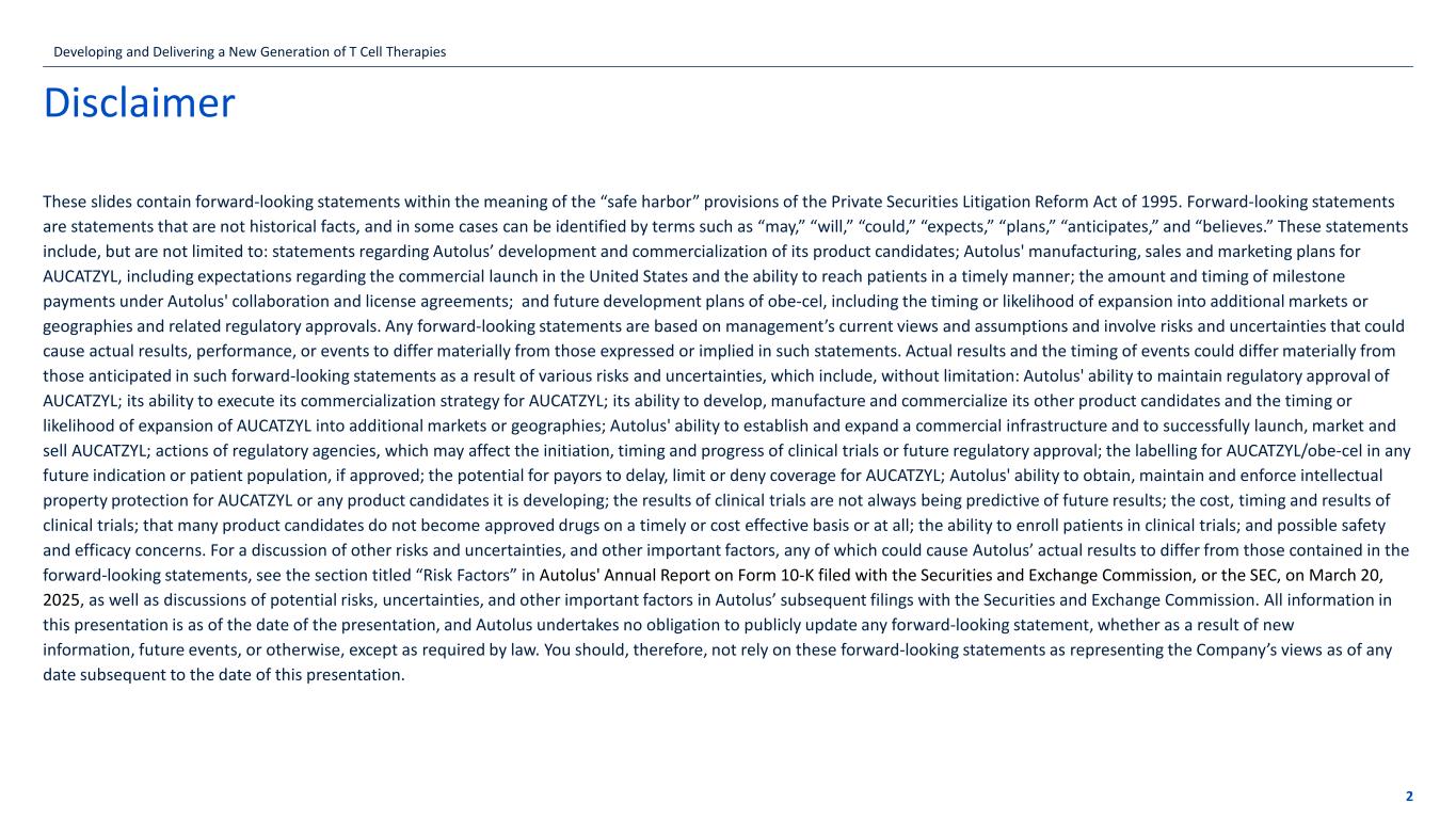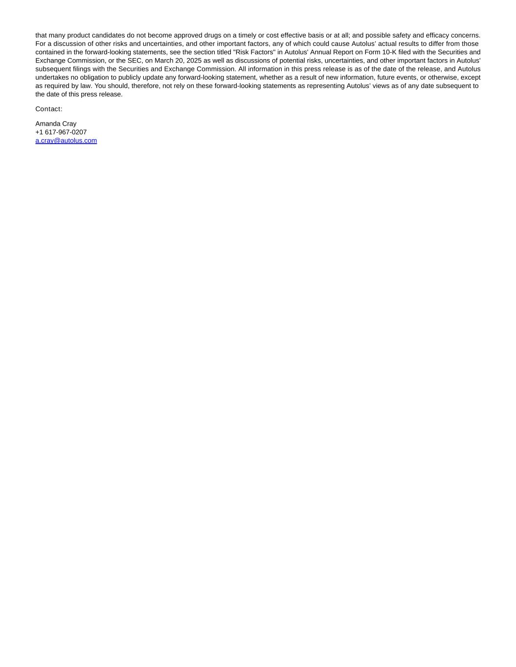 that many product candidates do not become approved drugs on a timely or cost effective basis or at all; and possible safety and efficacy concerns. For a discussion of other risks and uncertainties, and other important factors, any of which could cause Autolus’ actual results to differ from those contained in the forward-looking statements, see the section titled "Risk Factors" in Autolus' Annual Report on Form 10-K filed with the Securities and Exchange Commission, or the SEC, on March 20, 2025 as well as discussions of potential risks, uncertainties, and other important factors in Autolus' subsequent filings with the Securities and Exchange Commission. All information in this press release is as of the date of the release, and Autolus undertakes no obligation to publicly update any forward-looking statement, whether as a result of new information, future events, or otherwise, except as required by law. You should, therefore, not rely on these forward-looking statements as representing Autolus’ views as of any date subsequent to the date of this press release. Contact: Amanda Cray +1 617-967-0207 a.cray@autolus.com