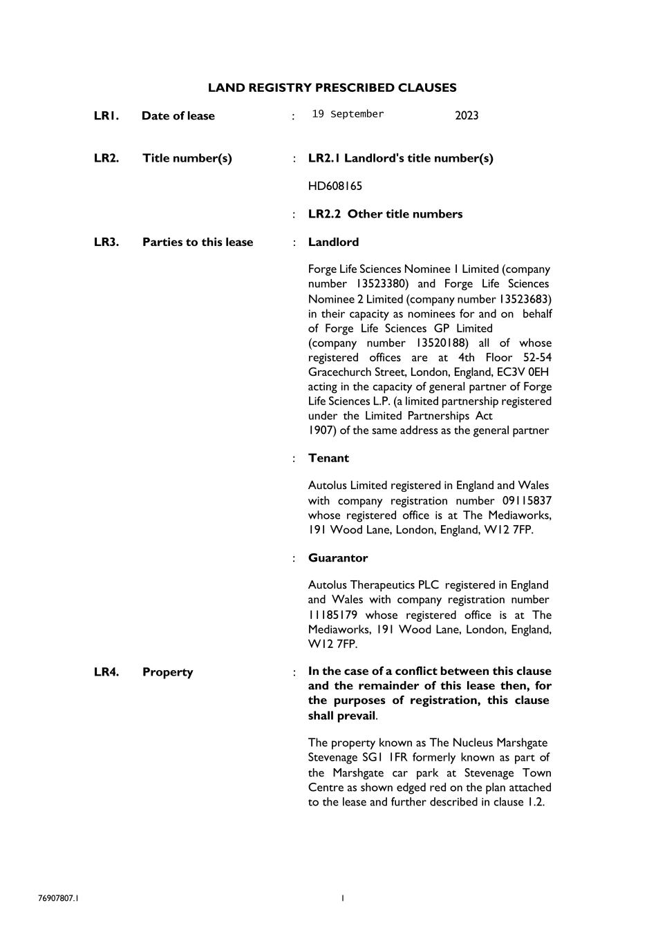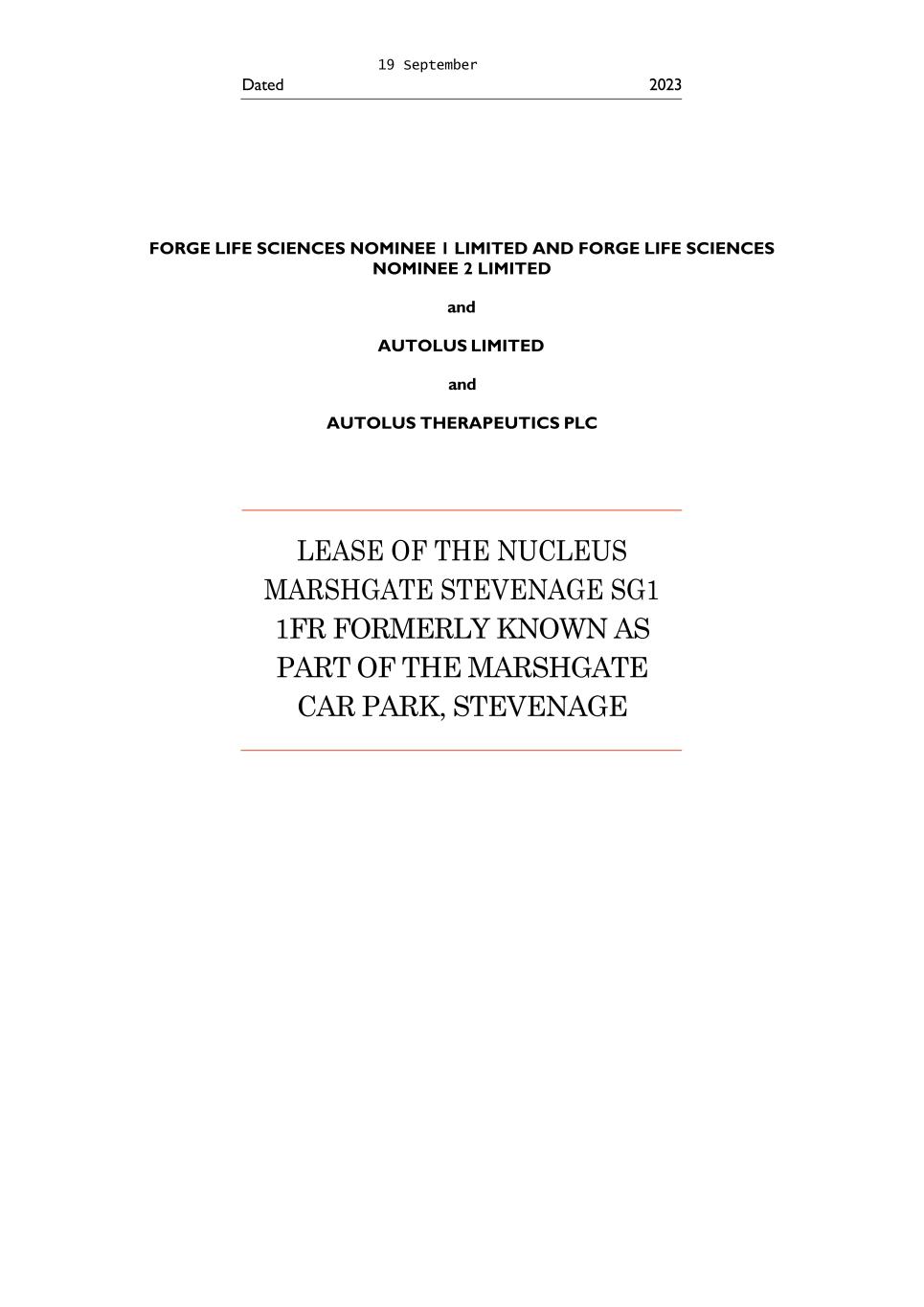 On September 19, 2023, we entered into a 20-year lease agreement with Forge Life Sciences Nominee for The Nucleus. We calculated the lease term for The Nucleus by taking into account, the noncancellable period specified in the agreement together with the periods a license fee was payable by us to the landlord for portions of The Nucleus handed over to us. The foregoing description of the Nucleus lease is qualified in its entirety by the lease itself, which is filed herewith.