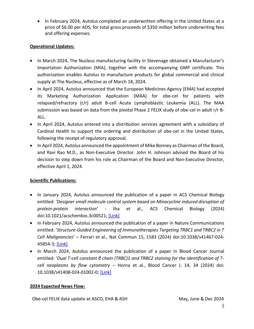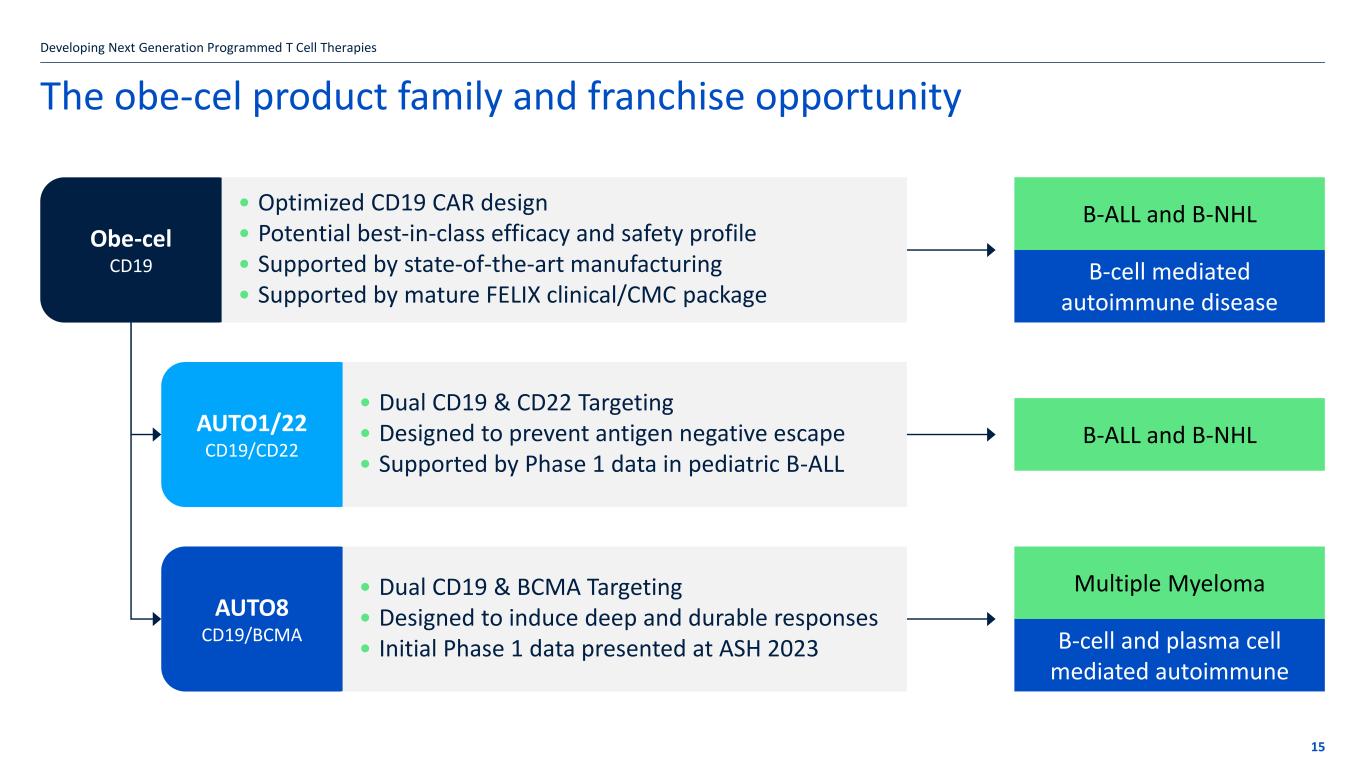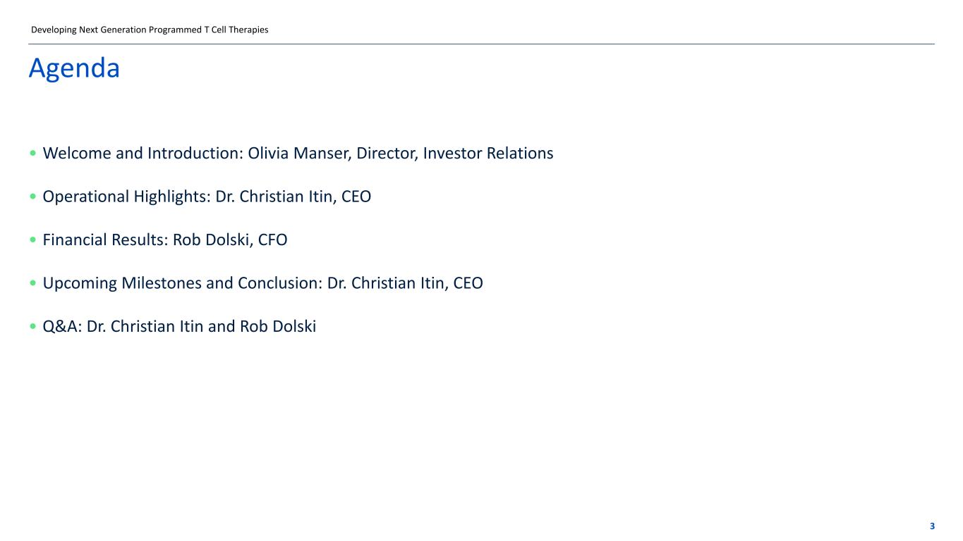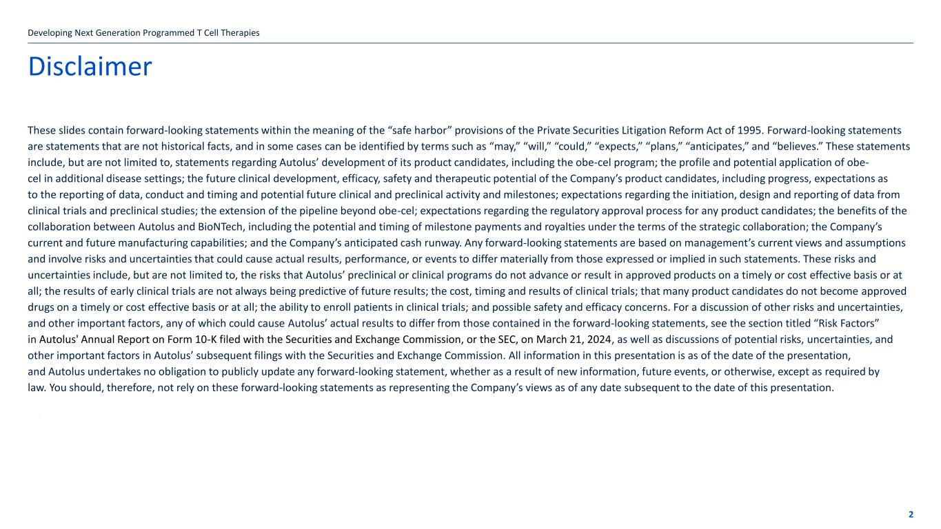 Disclaimer These slides contain forward-looking statements within the meaning of the “safe harbor” provisions of the Private Securities Litigation Reform Act of 1995. Forward-looking statements are statements that are not historical facts, and in some cases can be identified by terms such as “may,” “will,” “could,” “expects,” “plans,” “anticipates,” and “believes.” These statements include, but are not limited to, statements regarding Autolus’ development of its product candidates, including the obe-cel program; the profile and potential application of obe- cel in additional disease settings; the future clinical development, efficacy, safety and therapeutic potential of the Company’s product candidates, including progress, expectations as to the reporting of data, conduct and timing and potential future clinical and preclinical activity and milestones; expectations regarding the initiation, design and reporting of data from clinical trials and preclinical studies; the extension of the pipeline beyond obe-cel; expectations regarding the regulatory approval process for any product candidates; the benefits of the collaboration between Autolus and BioNTech, including the potential and timing of milestone payments and royalties under the terms of the strategic collaboration; the Company’s current and future manufacturing capabilities; and the Company’s anticipated cash runway. Any forward-looking statements are based on management’s current views and assumptions and involve risks and uncertainties that could cause actual results, performance, or events to differ materially from those expressed or implied in such statements. These risks and uncertainties include, but are not limited to, the risks that Autolus’ preclinical or clinical programs do not advance or result in approved products on a timely or cost effective basis or at all; the results of early clinical trials are not always being predictive of future results; the cost, timing and results of clinical trials; that many product candidates do not become approved drugs on a timely or cost effective basis or at all; the ability to enroll patients in clinical trials; and possible safety and efficacy concerns. For a discussion of other risks and uncertainties, and other important factors, any of which could cause Autolus’ actual results to differ from those contained in the forward-looking statements, see the section titled “Risk Factors” in Autolus' Annual Report on Form 10-K filed with the Securities and Exchange Commission, or the SEC, on March 21, 2024, as well as discussions of potential risks, uncertainties, and other important factors in Autolus’ subsequent filings with the Securities and Exchange Commission. All information in this presentation is as of the date of the presentation, and Autolus undertakes no obligation to publicly update any forward-looking statement, whether as a result of new information, future events, or otherwise, except as required by law. You should, therefore, not rely on these forward-looking statements as representing the Company’s views as of any date subsequent to the date of this presentation. Developing Next Generation Programmed T Cell Therapies 2