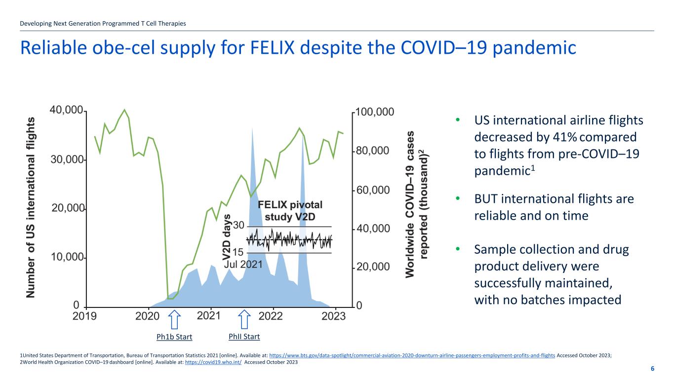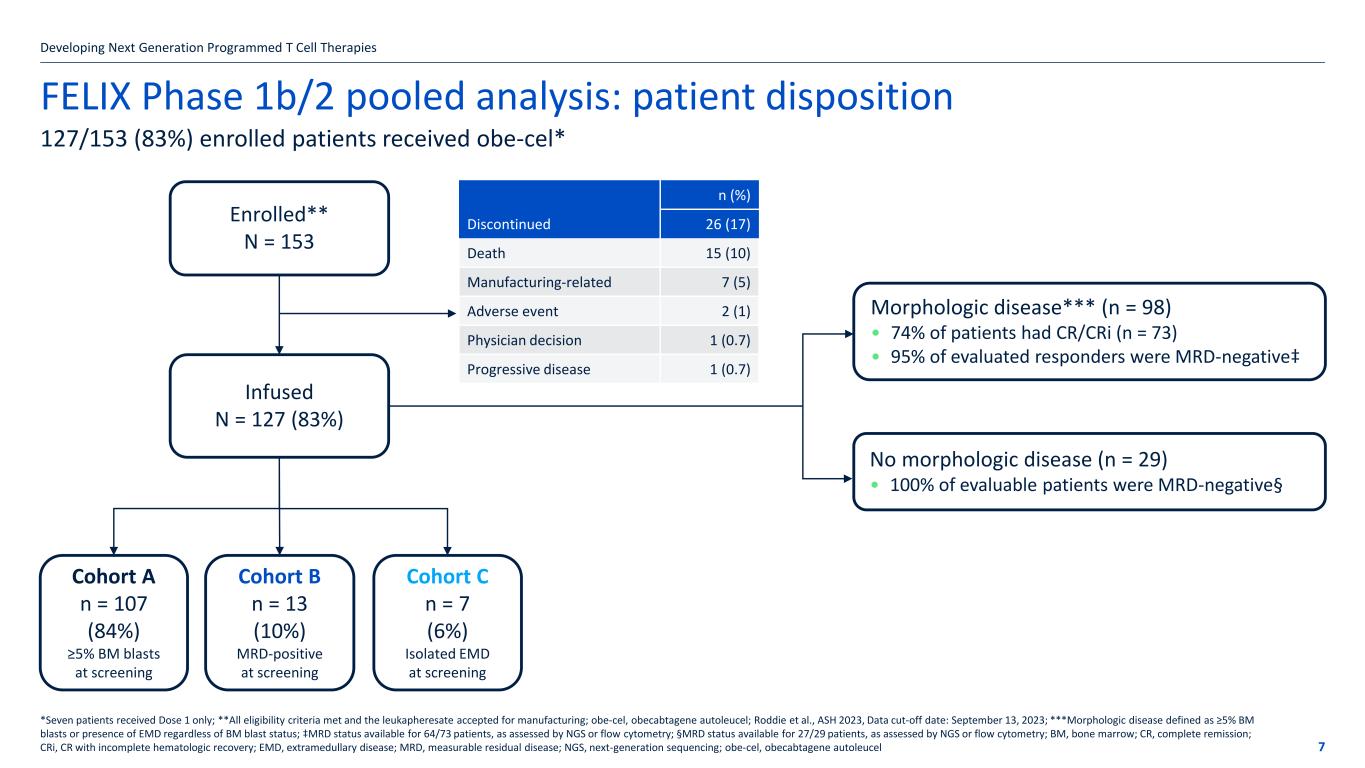 Reliable obe-cel supply for FELIX despite the COVID–19 pandemic Developing Next Generation Programmed T Cell Therapies 6 1United States Department of Transportation, Bureau of Transportation Statistics 2021 [online]. Available at: https://www.bts.gov/data-spotlight/commercial-aviation-2020-downturn-airline-passengers-employment-profits-and-flights Accessed October 2023; 2World Health Organization COVID–19 dashboard [online]. Available at: https://covid19.who.int/ Accessed October 2023 • US international airline flights decreased by 41% compared to flights from pre-COVID–19 pandemic1 • BUT international flights are reliable and on time • Sample collection and drug product delivery were successfully maintained, with no batches impacted Ph1b Start PhII Start