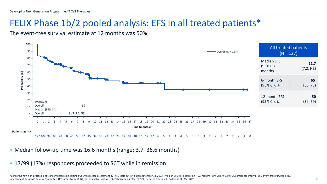FELIX Phase 1b/2 pooled analysis: patient disposition Developing Next Generation Programmed T Cell Therapies 7 127/153 (83%) enrolled patients received obe-cel* *Seven patients received Dose 1 only; **All eligibility criteria met and the leukapheresate accepted for manufacturing; obe-cel, obecabtagene autoleucel; Roddie et al., ASH 2023, Data cut-off date: September 13, 2023; ***Morphologic disease defined as ≥5% BM blasts or presence of EMD regardless of BM blast status; ‡MRD status available for 64/73 patients, as assessed by NGS or flow cytometry; §MRD status available for 27/29 patients, as assessed by NGS or flow cytometry; BM, bone marrow; CR, complete remission; CRi, CR with incomplete hematologic recovery; EMD, extramedullary disease; MRD, measurable residual disease; NGS, next-generation sequencing; obe-cel, obecabtagene autoleucel Discontinued n (%) 26 (17) Death 15 (10) Manufacturing-related 7 (5) Adverse event 2 (1) Physician decision 1 (0.7) Progressive disease 1 (0.7) Infused N = 127 (83%) Enrolled** N = 153 Cohort A n = 107 (84%) ≥5% BM blasts at screening Cohort B n = 13 (10%) MRD-positive at screening Cohort C n = 7 (6%) Isolated EMD at screening Morphologic disease*** (n = 98) • 74% of patients had CR/CRi (n = 73) • 95% of evaluated responders were MRD-negative‡ No morphologic disease (n = 29) • 100% of evaluable patients were MRD-negative§