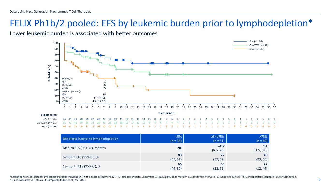 FELIX Phase 1b/2 pooled analysis: EFS in all treated patients* • Median follow-up time was 16.6 months (range: 3.7−36.6 months) • 17/99 (17%) responders proceeded to SCT while in remission Developing Next Generation Programmed T Cell Therapies 8 The event-free survival estimate at 12 months was 50% *Censoring new non-protocol anti-cancer therapies including SCT with disease assessment by IRRC (data cut-off date: September 13, 2023); Median EFS: ITT population − 9.8 months (95% CI: 5.9, 12.9); CI, confidence interval; EFS, event-free survival; IRRC, Independent Response Review Committee; ITT, intent-to-treat; NE, not evaluable; obe-cel, obecabtagene autoleucel; SCT, stem cell transplant; Roddie et al., ASH 2023 Events, n: Overall Median (95% CI): Overall 59 11.7 (7.2, NE) P ro b ab ili ty ( % ) 0 10 20 30 40 50 60 70 80 90 100 Time (months) 0 1 2 3 4 5 6 7 8 9 10 11 12 13 14 15 16 17 18 19 20 21 22 23 24 25 26 27 28 29 30 31 32 33 34 35 36 37 Overall (N = 127) Patients at risk 127 104 94 85 78 68 60 55 52 45 34 33 29 27 27 22 18 18 16 12 12 6 5 4 4 4 3 3 3 3 2 2 2 2 2 2 1 0 All treated patients (N = 127) Median EFS (95% CI), months 11.7 (7.2, NE) 6-month EFS (95% CI), % 65 (56, 73) 12-month EFS (95% CI), % 50 (39, 59)