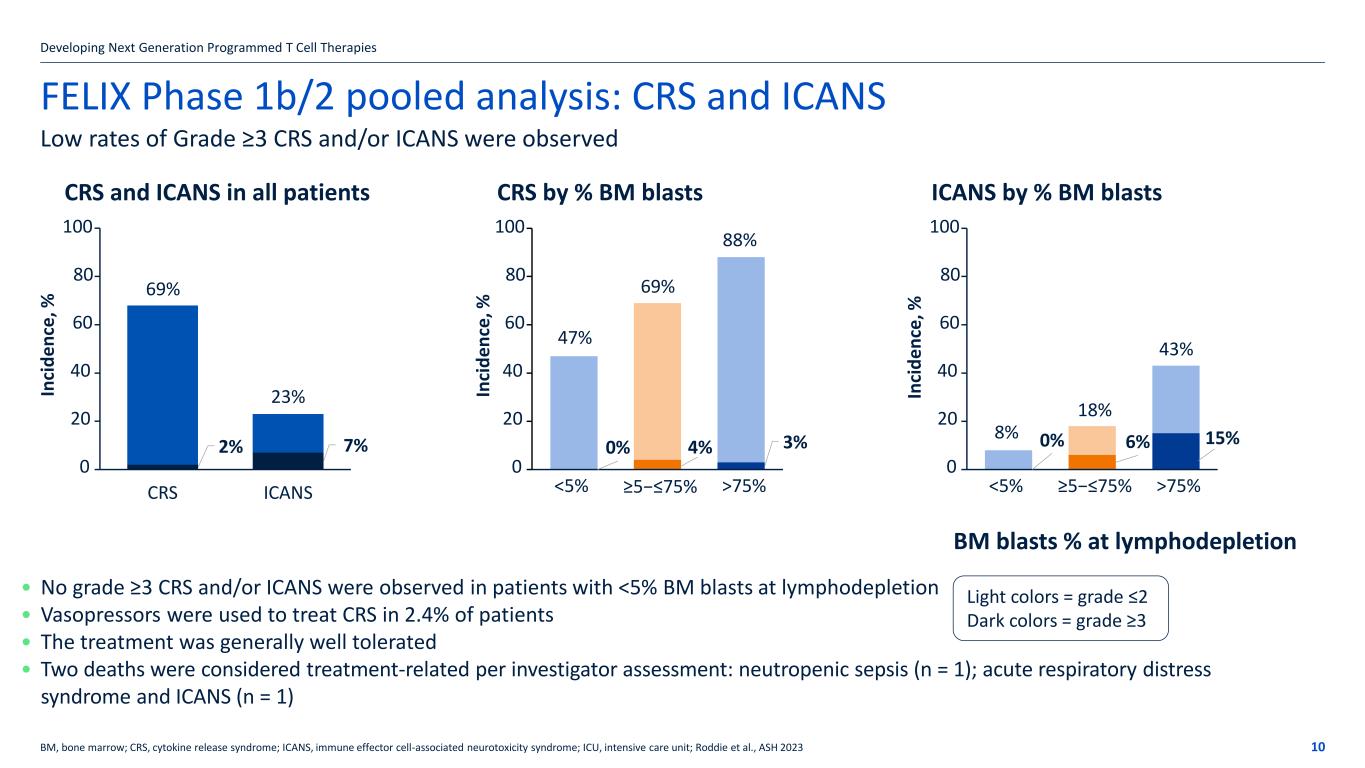 FELIX Ph1b/2 pooled: EFS by leukemic burden prior to lymphodepletion* Developing Next Generation Programmed T Cell Therapies 9 Lower leukemic burden is associated with better outcomes *Censoring new non-protocol anti-cancer therapies including SCT with disease assessment by IRRC (data cut-off date: September 13, 2023); BM, bone marrow; CI, confidence interval; EFS, event-free survival; IRRC, Independent Response Review Committee; NE, not evaluable; SCT, stem cell transplant; Roddie et al., ASH 2023 BM blasts % prior to lymphodepletion <5% (n = 36) ≥5−≤75% (n = 51) >75% (n = 40) Median EFS (95% CI), months NE 15.0 (6.6, NE) 4.5 (1.5, 9.0) 6-month EFS (95% CI), % 83 (65, 92) 72 (57, 82) 40 (23, 56) 12-month EFS (95% CI), % 65 (44, 80) 55 (38, 69) 27 (12, 44) Events, n: <5% 10 ≥5−≤75% 22 >75% 27 Median (95% CI): <5% NE ≥5−≤75% 15 (6.6, NE) >75% 4.5 (1.5, 9.0) Patients at risk <5% (n = 36) ≥5−≤75% (n = 51) >75% (n = 40) <5% (n = 36) ≥5−≤75% (n = 51) >75% (n = 40) 0 1 2 3 4 5 6 7 8 9 10 11 12 13 14 15 16 17 18 19 20 21 22 23 24 25 26 27 28 29 30 31 32 33 34 35 36 37 36 34 31 28 25 24 22 20 19 18 14 13 11 11 11 11 8 8 7 6 6 2 2 2 2 2 1 1 1 1 1 1 1 1 1 1 0 0 51 43 41 39 36 31 28 25 23 18 15 15 13 12 12 9 8 8 7 4 4 2 1 1 1 1 1 1 1 1 1 1 1 1 1 1 1 0 40 27 22 18 17 13 10 10 10 9 5 5 5 4 4 2 2 2 2 2 2 2 2 1 1 1 1 1 1 1 0 0 0 0 0 0 0 0 Time (months) 0 10 20 30 40 50 60 70 80 90 100 P ro b ab ili ty ( % )