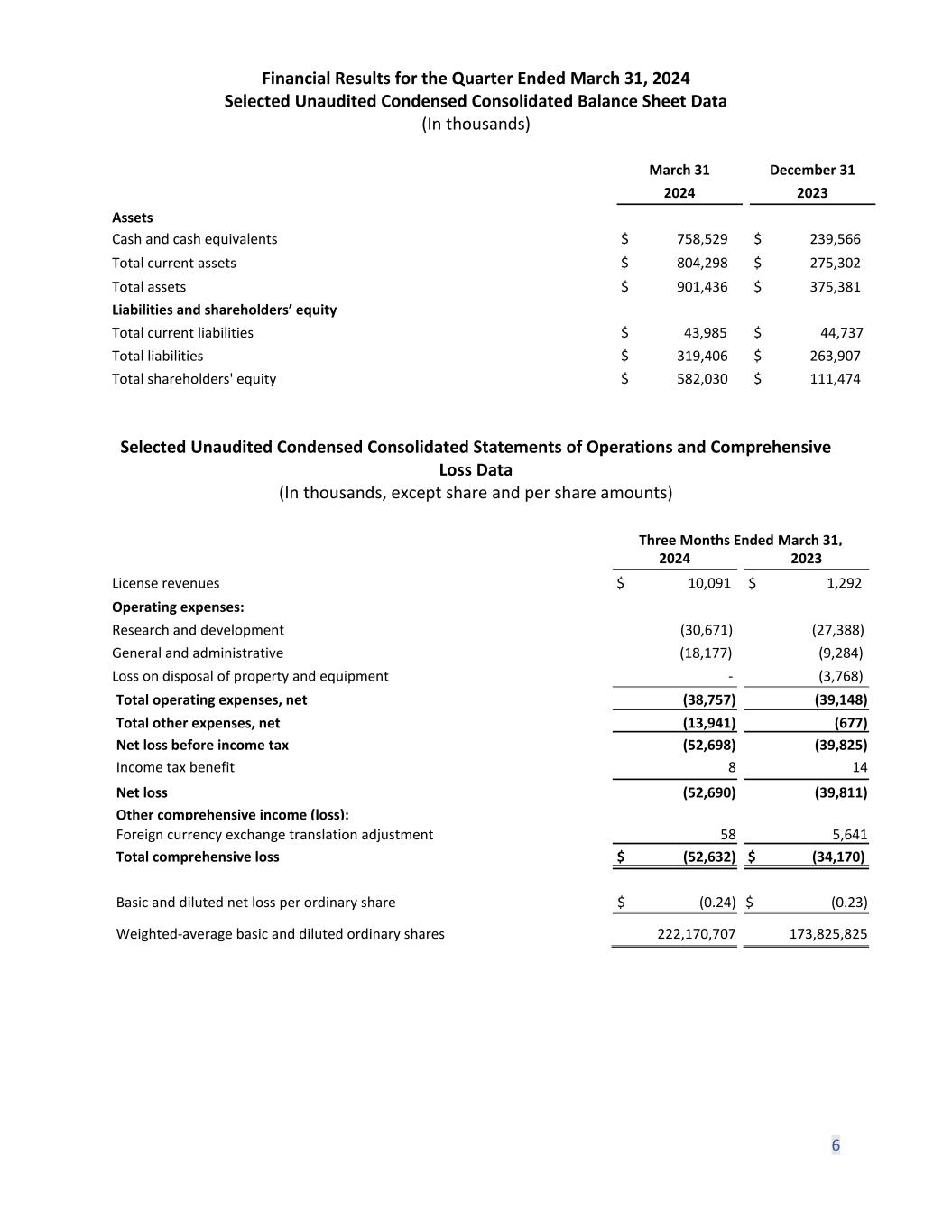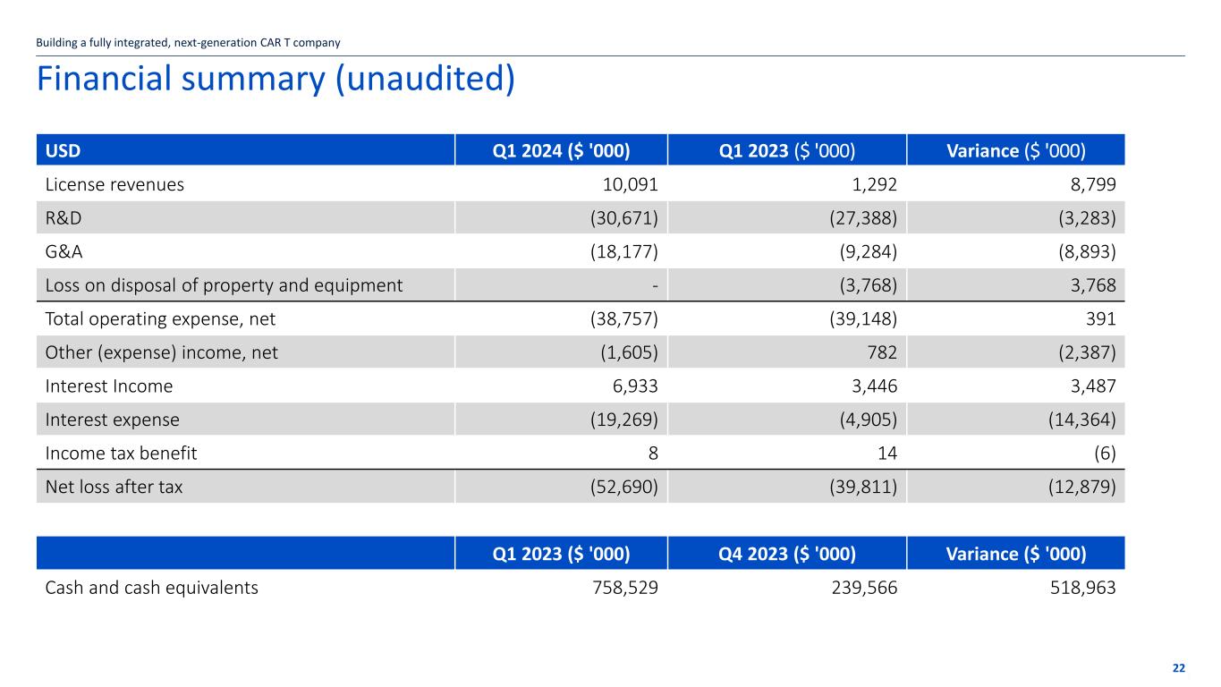 Financial summary (unaudited) USD Q1 2024 ($ '000) Q1 2023 ($ '000) Variance ($ '000) License revenues 10,091 1,292 8,799 R&D (30,671) (27,388) (3,283) G&A (18,177) (9,284) (8,893) Loss on disposal of property and equipment - (3,768) 3,768 Total operating expense, net (38,757) (39,148) 391 Other (expense) income, net (1,605) 782 (2,387) Interest Income 6,933 3,446 3,487 Interest expense (19,269) (4,905) (14,364) Income tax benefit 8 14 (6) Net loss after tax (52,690) (39,811) (12,879) Q1 2023 ($ '000) Q4 2023 ($ '000) Variance ($ '000) Cash and cash equivalents 758,529 239,566 518,963 Building a fully integrated, next-generation CAR T company 22